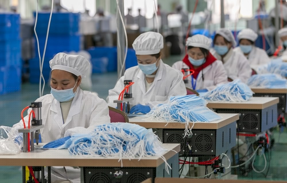 A file photo shows workers make face masks at a Chinese plant in Shanghai on April 8, 2022.