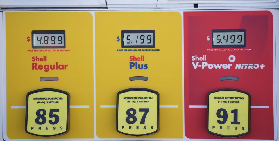 The prices are displayed over the various grades of gasoline available at a Shell station, on June 8, 2022, in Englewood, Colo.