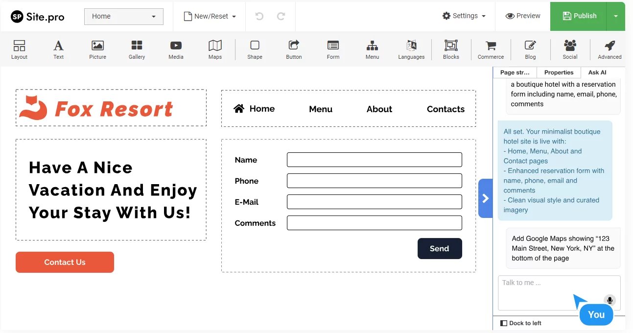But creating a website that respects users’ time, is SEO-friendly, and professionally designed is not a difficult task, nor does it have to be expensive. You can create a website with the help of AI website builders. On Site.pro the process doesn’t take longer than five minutes—enter a prompt (a description of your business, your preferences for design), wait for AI to build for you, and then edit it. You can give AI commands via voice and text to move elements of the page, create new sections, generate new content, etc. The website created with Site.pro’s AI will be responsive to all screens, while remaining fast and light, built fully with HTML.