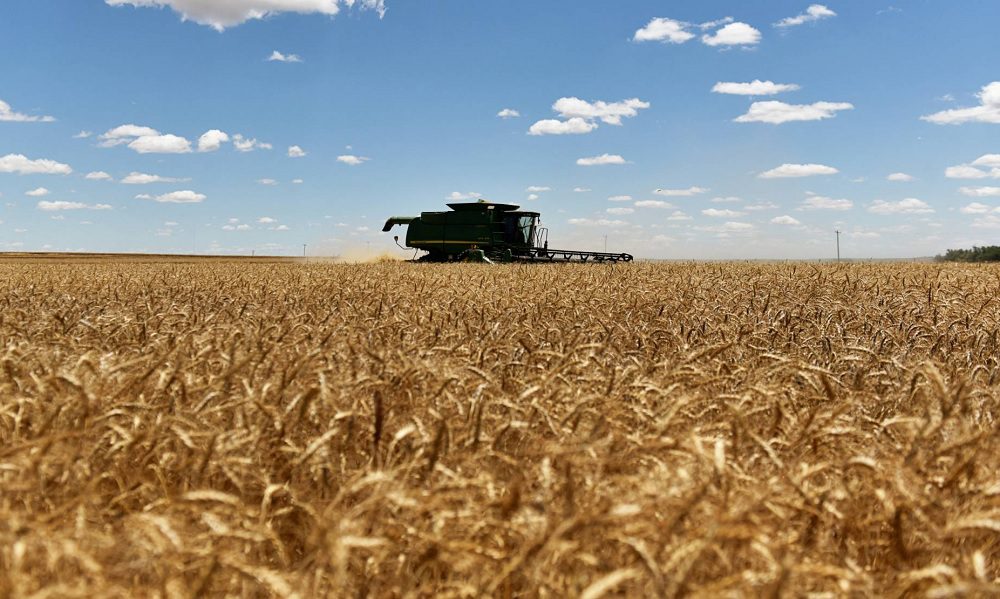 A combine harvests winter wheat in Corn, Oklahoma, US.