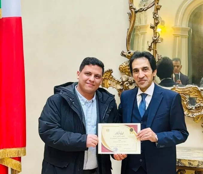 Bassam Rady, the Egyptian Ambassador to Italy, received at the embassy headquarters in Rome the Egyptian, Mark Girgis, from the Minya Governorate, who has deservedly excelled  in the field of “mechatronics” sciences, by obtaining, over the course of five consecutive years, a record average of 100 per cent for the duration of his studies on the scholarship provided to him by Misr Al-Khair Foundation.