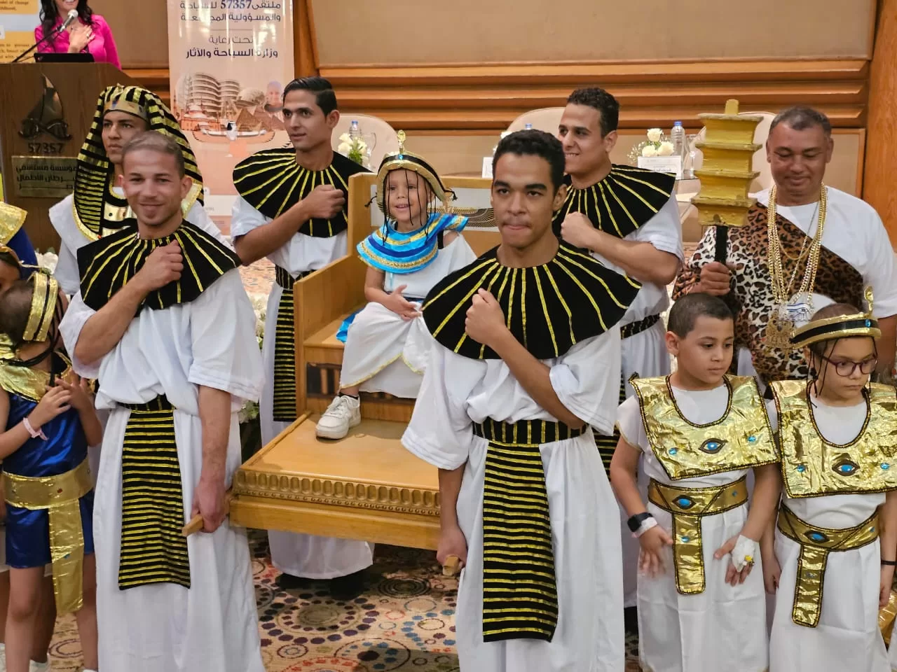 A parade of children and young people dressed in Pharaonic costumes streams into the hall to the sound of ancient Egyptian music, proudly carrying 4-year-old Yamen, who is sitting like a royal figure on a coronation chair.