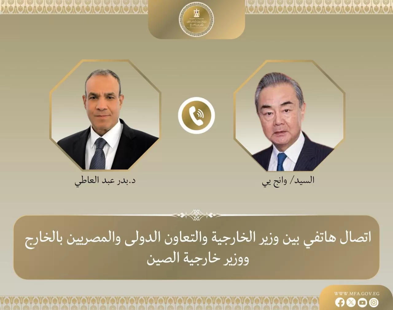 Minister of Foreign Affairs, International Cooperation and Egyptian Expatriates Badr Abdel-Aati held a phone call on Thursday with his Chines counterpart Wang Yi, to discuss ways to enhance bilateral relations and address regional and international developments.