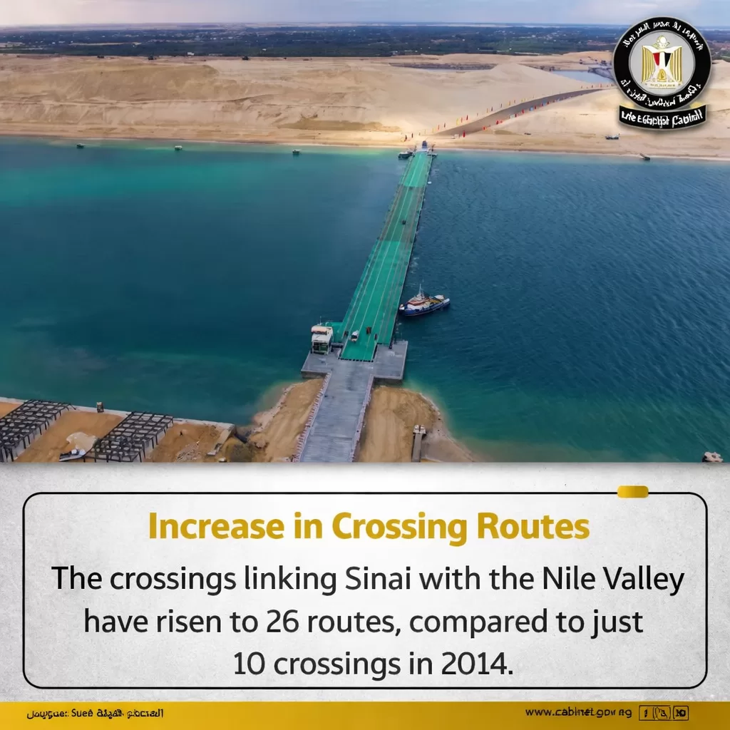 The number of crossings has increased from 10 in 2014 to 26 today, including eight ferry routes, six tunnels, and nine floating bridges, alongside major crossings such as the Peace Bridge, El Ferdan Bridge, and the East Port Said Container Terminal crossing.