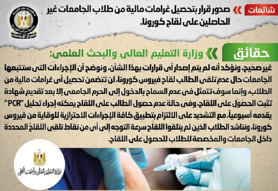 Egyptian Cabinet media center denied reports about a decision issued to collect fines from the university students who did not get the coronavirus vaccine.