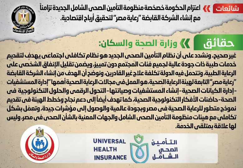 CAIRO – The Egyptian Cabinet media center has denied reports that the government is willing to privatize the new universal health insurance system in conjunction with the establishment of “Reayat Misr” holding company to achieve economic revenues.