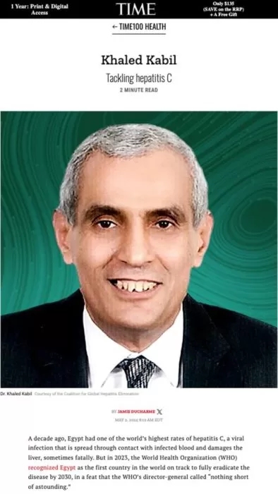 The US Time magazine has chosen Head of the Egypt’s National Committee for Prevention and Control of Viral Hepatitis, Dr Khaled Kabil, among the world’s 100 most influential characters in the field of health (Time’s 100 Health).