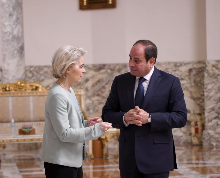 European Commission President Ursula von der Leyen said she agrees with President Abdel Fattah El Sisi on saying no to any attempted forced displacement of Palestinians, adding that she shares his stance on the need for a political horizon based on a two-state solution.