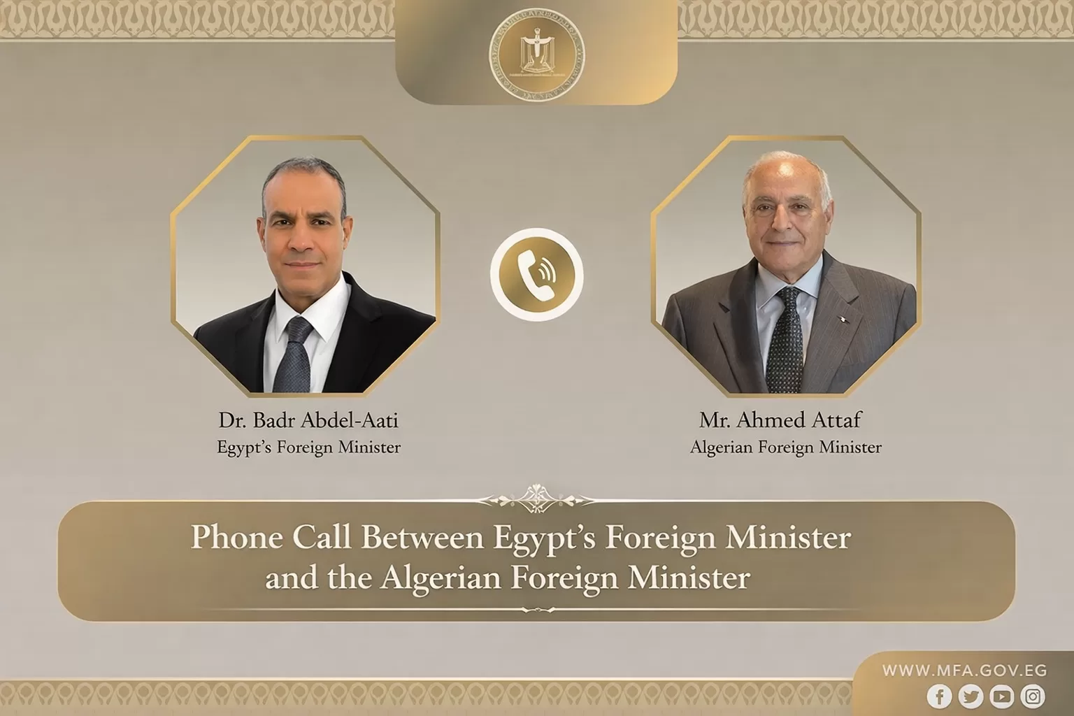 Minister of Foreign Affairs, International Co-operation, and Egyptian Expatriates, Badr Abdel-Aati, held a phone call on Wednesday with Algerian Minister of Foreign Affairs and the National Community Abroad Ahmed Attaf. The discussion focused on rapid regional developments and the serious military escalation affecting the region.