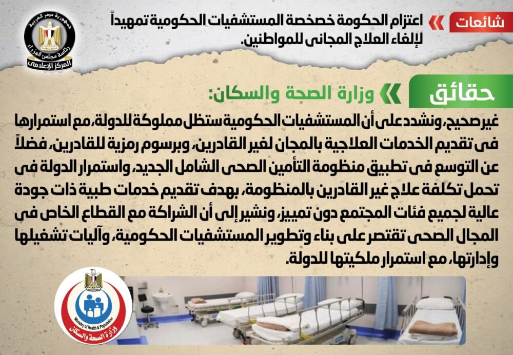 The Egyptian Cabinet denied media reports claiming that the government plans to privatize public hospitals in preparation for cancelling free of charge medical services.