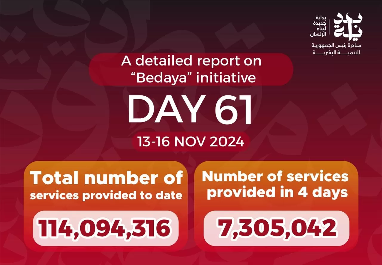 The “Bedaya – A New Beginning for Human Development” initiative has so far offered some impressive 114,094,316 services since it was launched, Deputy Prime Minister for Human Development and Minister of Health and Population has said..Just over the past five days, the initiative provided 7,305,042 services, covering health, social support, education, and community development.The key achievements of the initiative in the Youth and Sports domain, over 307,000 participants have benefited from 3,472 activities. In Child Development Awareness, 46,189 individuals received guidance on the importance of the first 1,000 days of a child’s life.As for Social Support, assistance programmes benefited 20,198 citizens, while 85,430 received cash support cards under the “Takaful and Karama” (Solidarity and Dignity) programme.In addition, up to 577 disability identification cards were issued, and 6,545 individuals accessed rehabilitation services. Also the Rural Women Training Project provided vocational skills to 31,155 women. Moreover, in the Livelihood Support, 2.3 tonnes of meat were distributed on 2,339 beneficiary families, and 50 development convoys reached 24,572 citizens.