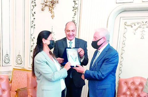 South Sinai Governor Khaled Fouda presenting a souvenir to Farida Mohamed Khamis, chairman of the board of trustees of the BUE, following their meeting in Cairo yesterday.