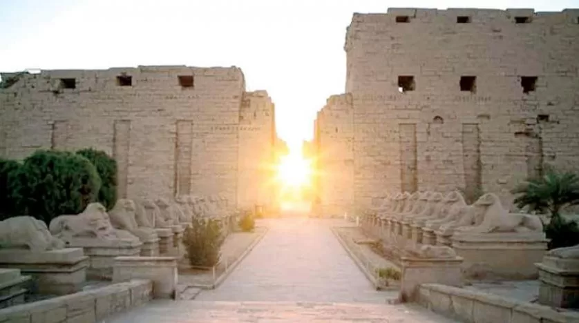 The sun shines on the main axis of the Karnak Temple in the solar alignment phenomenon, passing through the eastern gate and ending at the temple’s main pylon.