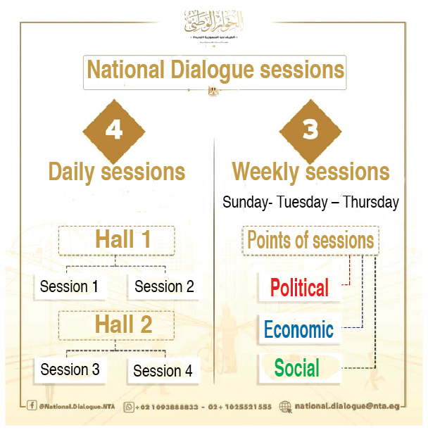 General Coordinator of the National Dialogue’s Board Diaa Rashwan has said that sessions of the National Dialogue will kick off next week. The sessions will be held on Sundays, Tuesdays and Thursdays of every week. Around four session panels will be held daily to discuss several topics of mutual concern.