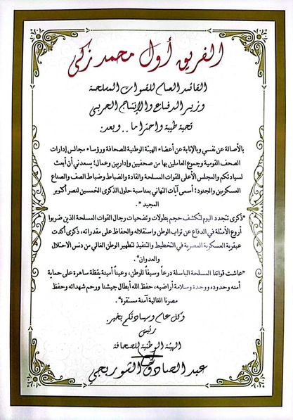 Shorbagi also greeted Defense Minister Mohamed Zaki and the Armed Forces on the golden jubilee of the victory.