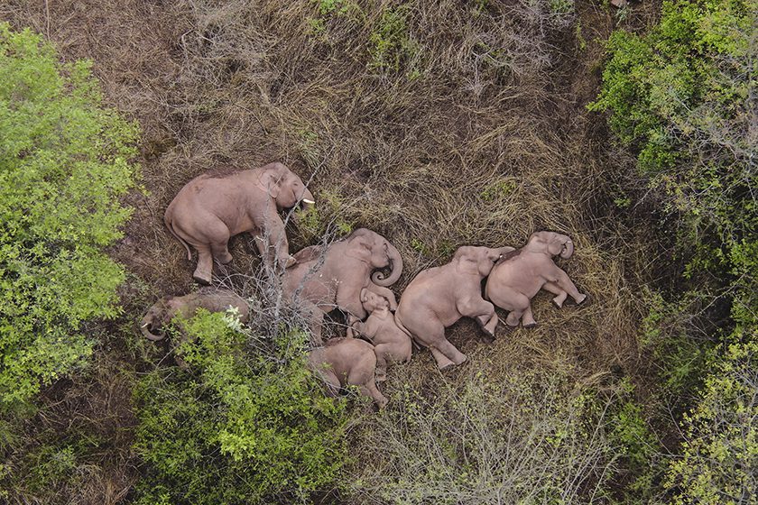A wild Asian elephant herd left the Xishuangbanna National Nature Reserve in Yunnan Province in China and started marching north in mid-March. After passing through several counties and occasionally wandering into villages and towns, they have stopped and taken a rest in a suburban area of Kunming City.