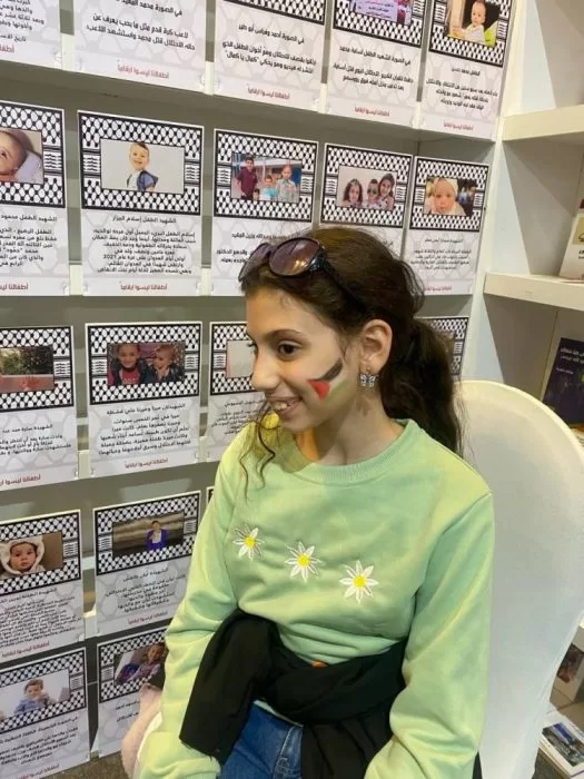 Children sit at the pavilion to have the Palestinian flag drawn on their cheeks, with its beautiful green; white; red, and black colours.