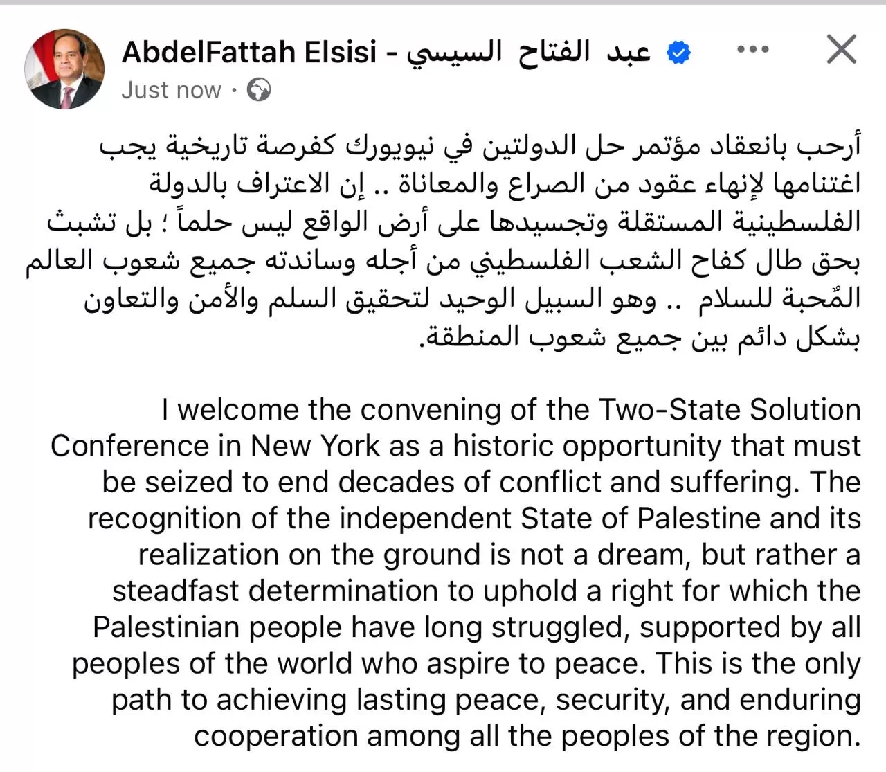 President Abdel Fattah El Sisi has welcomed the convening of the Two-State Solution Conference in New York, describing it as a historic opportunity that must be seized to bring an end to decades of conflict and suffering in the Middle East.