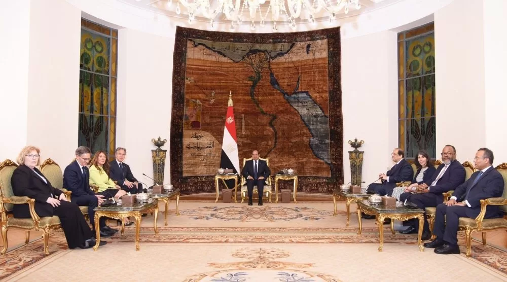 Egyptian President Abdel Fattah El Sisi on Monday met US Secretary of State Antony Blinken and his accompanying delegation in the presence of General Intelligence Service Chief Abbas Kamel, Presidency Spokesman Ahmed Fahmy said.