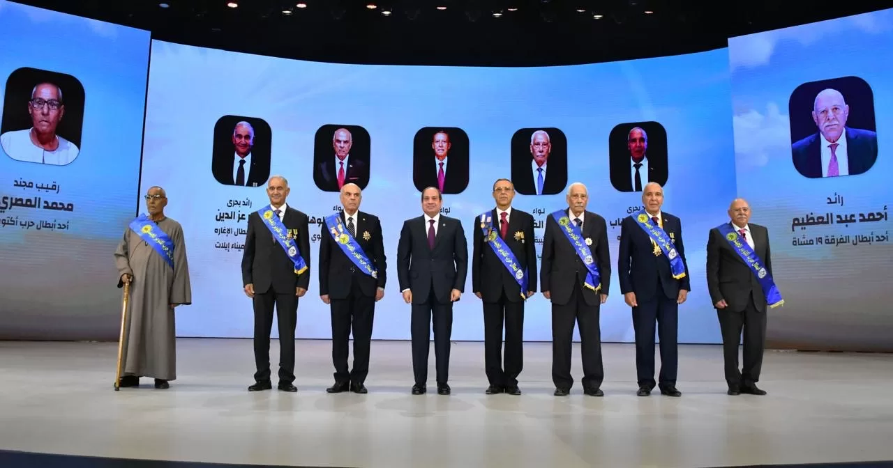 CAIRO – Egyptian President Abdel Fattah El Sisi on Monday posed for a photo op with seven heroes of the 6th of October War, who were honored during the 40th Armed Forces Cultural Symposium.