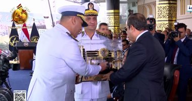 Egyptian President Abdel Fattah El Sisi received on Tuesday a souvenir from Assistant Interior Minister and Head of the Police Academy Hani Abuel-Makarem during the graduation ceremony of a new batch of police cadets.