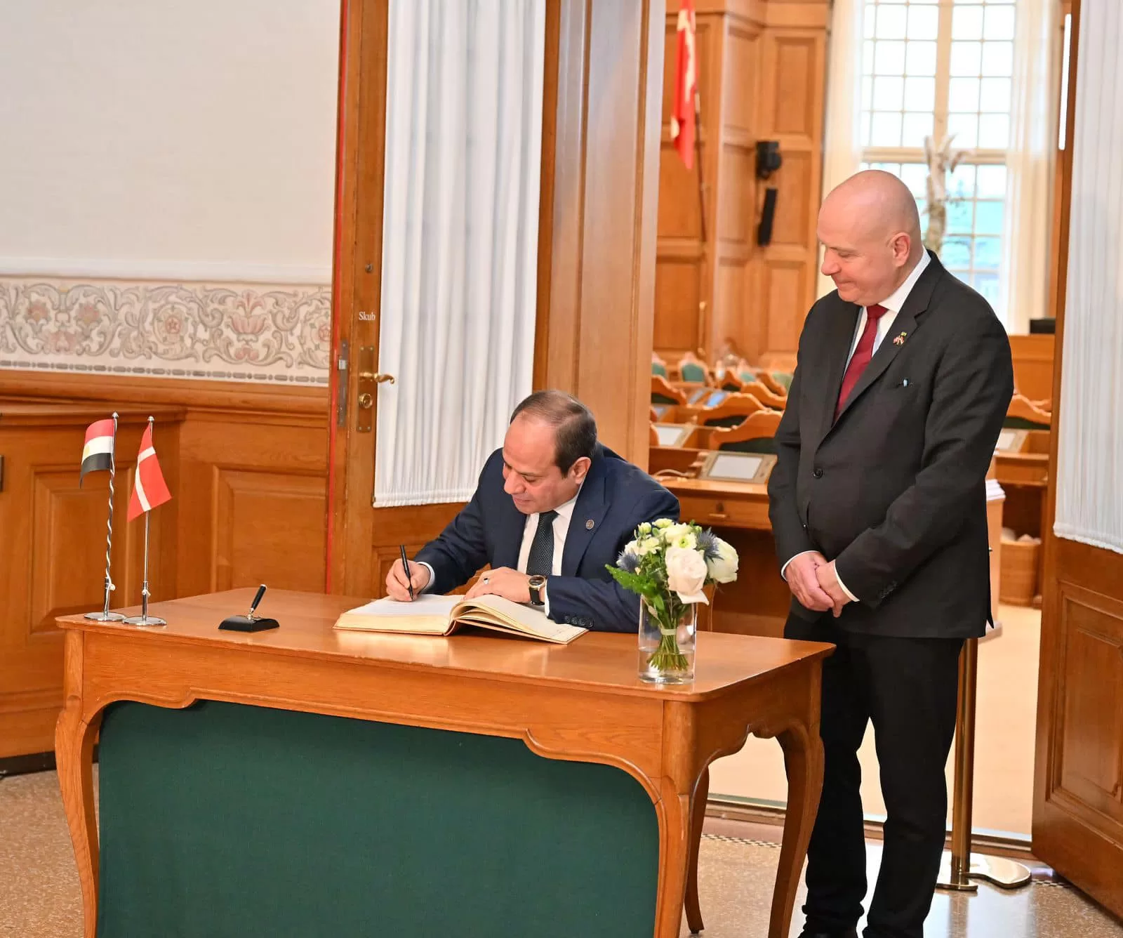 Egypt’s President Abdel Fattah El Sisi on Saturday signed the Guestbook of the Danish Parliament on the sidelines of the state visit he is paying to Denmark.