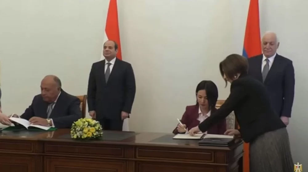 YEREVAN – Egyptian President Abdel Fattah El Sisi and his Armenian counterpart Vahagn Khachaturyan witnessed on Sunday the inking of a number of co-operation agreements between the two countries at the presidential palace in Yerevan.