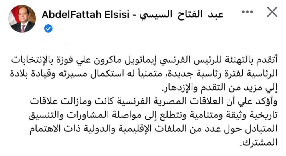 CAIRO – Egypt’s President Abdel Fattah El Sisi on Sunday congratulated Emmanuel Macron on his victory in the French presidential elections.