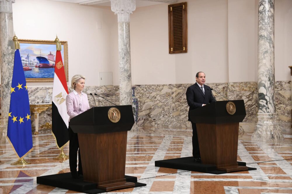 He welcomed the EU Commission president for her first official visit to Egypt, noting that this falls within the framework of keenness on consultations and exchanging views on means of furthering partnership and co-operation in various domains.