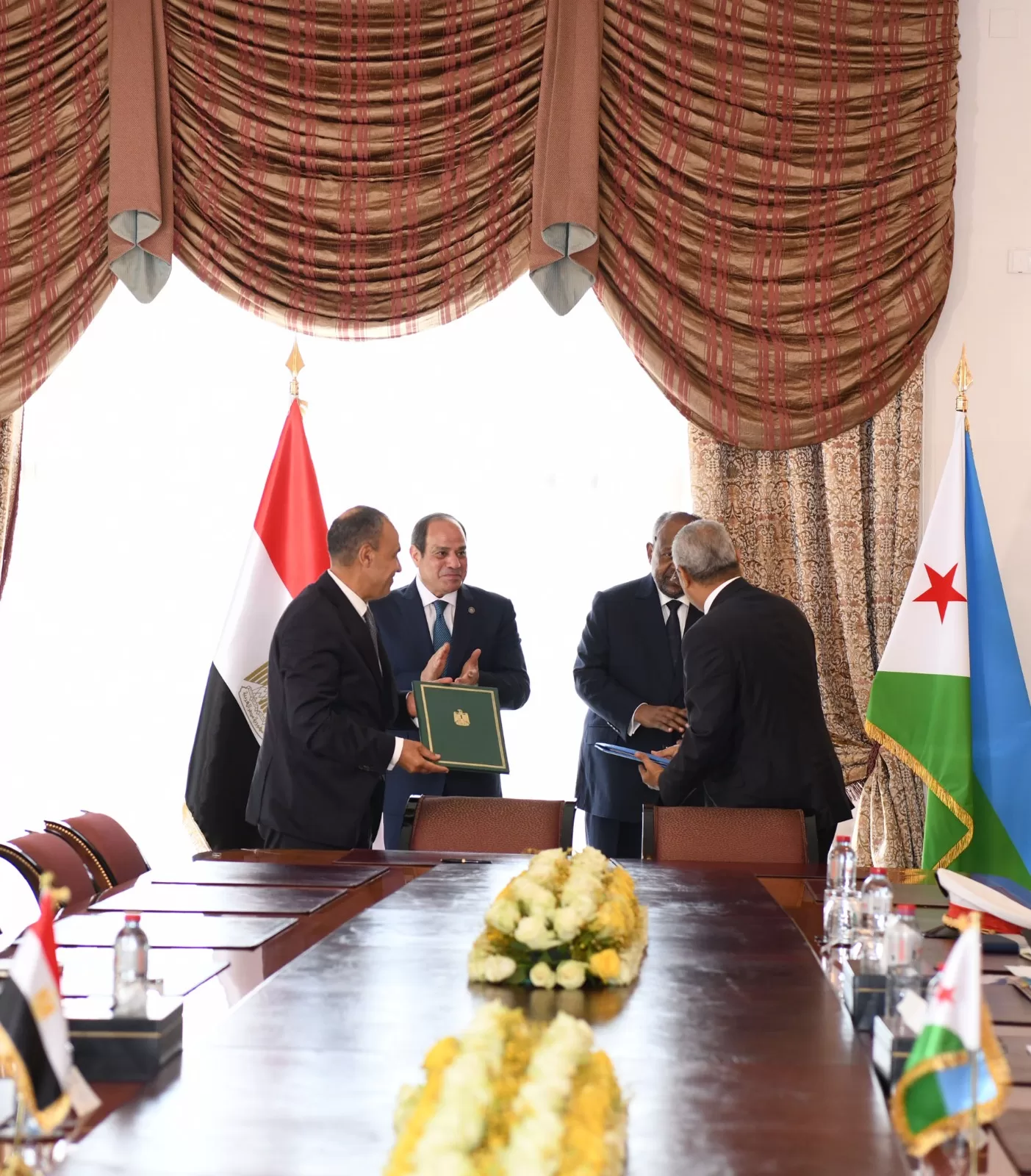 President Sisi and President Guelleh discussed ways to strengthen bilateral relations and joint coordination on regional developments in the Red Sea and the Horn of Africa.