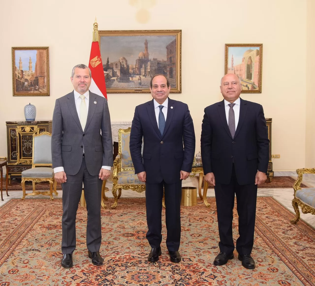 Egypt’s President Abdel Fattah El Sisi met on Tuesday with Secretary-General of the International Maritime Organisation (IMO) Arsenio Dominguez, in the presence of Deputy Prime Minister for Industrial Development and Minister of Industry and Transport Kamel El-Wazir.