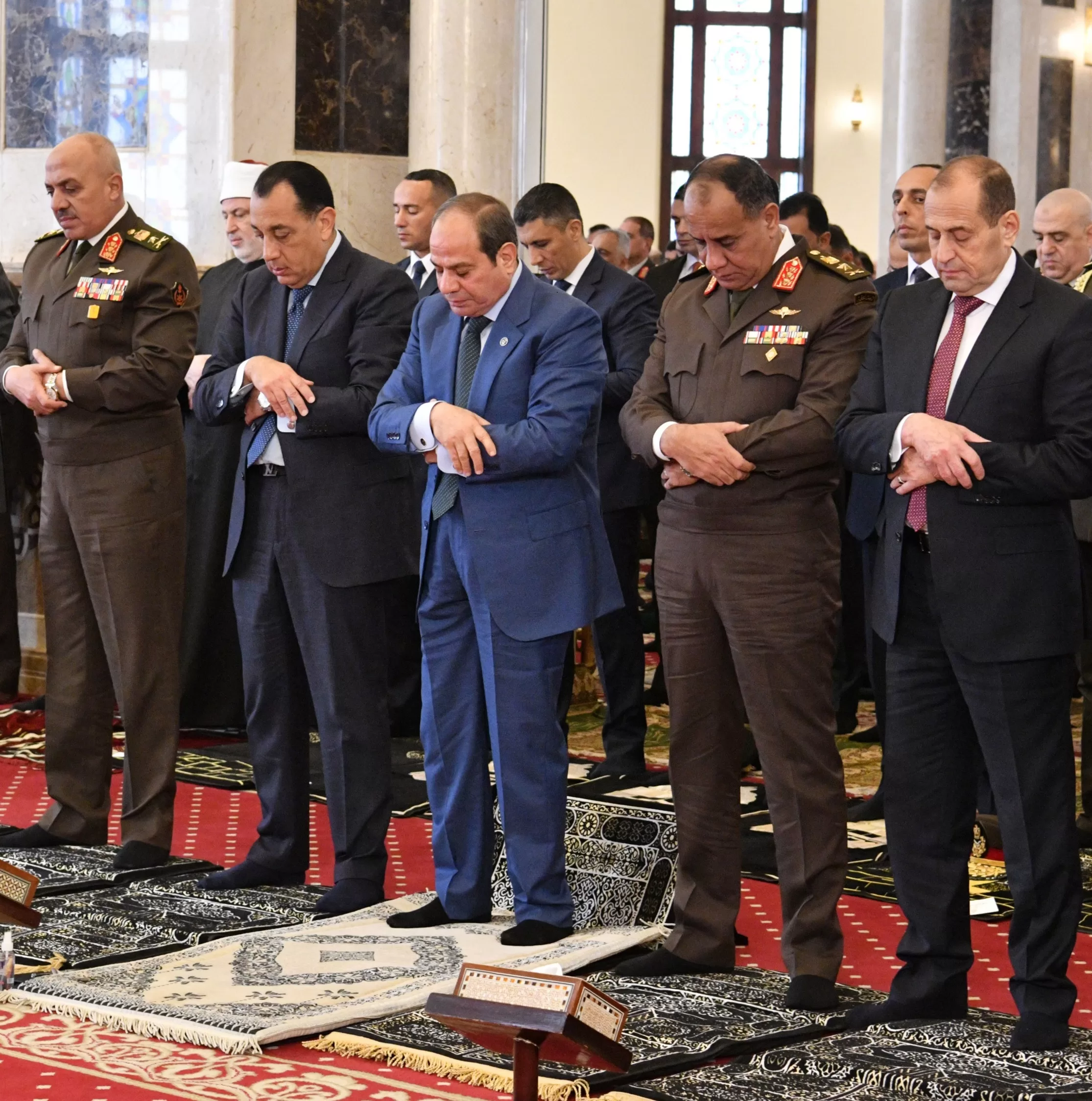 Upon arrival at the mosque, President Sisi was received by Prime Minister Mostafa Madbouly, Minister of Awqaf Osama Azhari, Minister of Interior Mahmoud Tawfik, Minister of Health and Population Khaled Abdel Ghaffar, along with a number of senior officials and state figures.