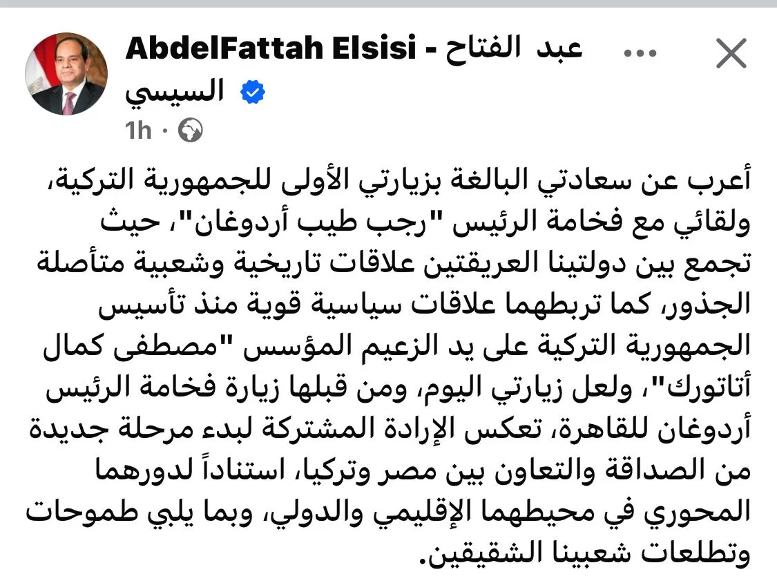 “I am very delighted with my first visit to the Republic of Türkiye and my meeting with President Recep Tayyip Erdogan,” President Abdel Fattah El Sisi wrote on his official Facebook page on Wednesday.