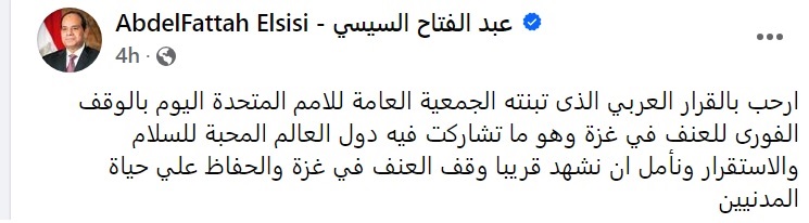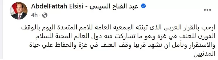 Egypt’s President Abdel Fattah El Sisi welcomed on Friday a UN General Assembly’s resolution calling for a humanitarian truce in Gaza leading to a cessation of hostilities.