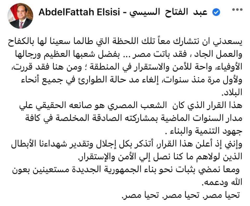 President Sisi said Monday that he had decided not to extend the state of emergency another time, citing improving security and political conditions in Egypt.