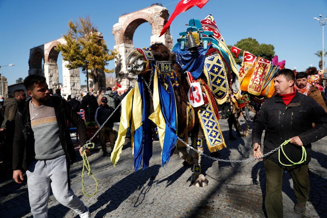 A wrestling camel adorned with colourful ornaments is paraded during the Camel Beauty Contest ahead of the annual 40th Efes Selcuk Camel Wrestling Festival, in the Aegean town of Selcuk, near Izmir, Turkey January 15, 2022.