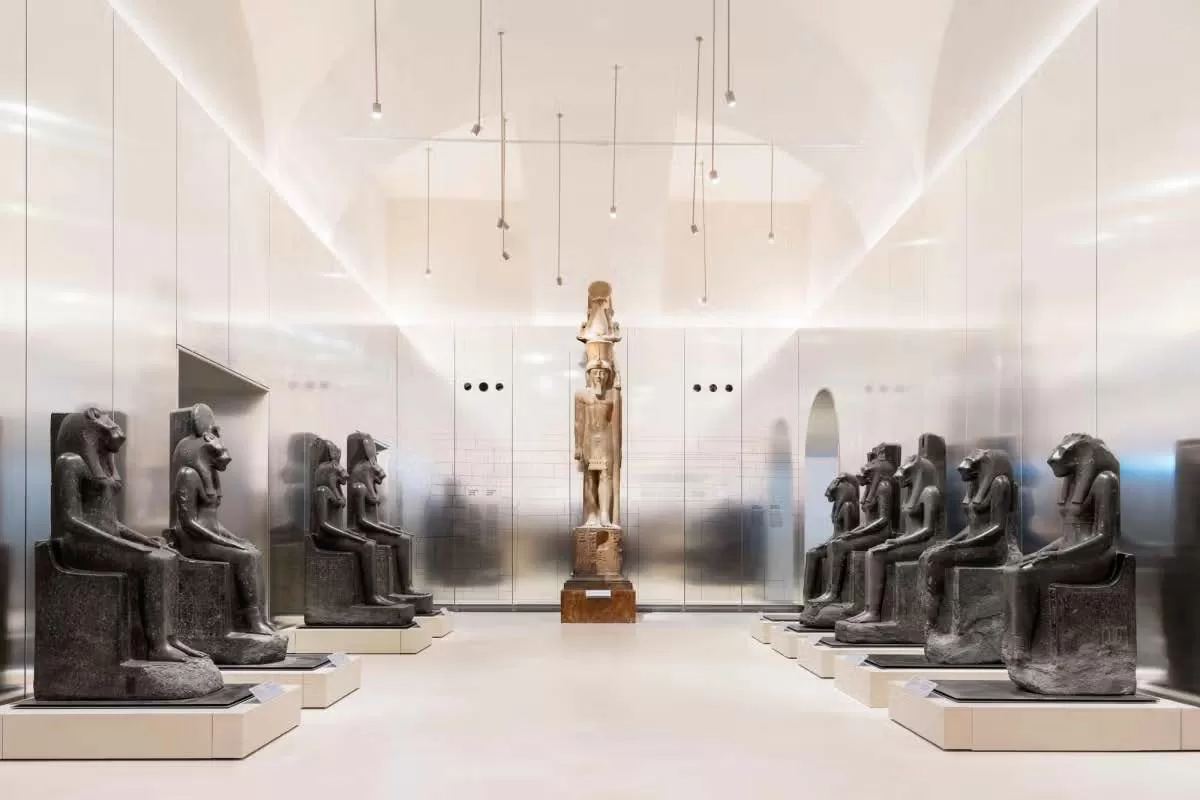 In the first case, the new design combines the curatorial expertise of the Museo Egizio team with an installation project designed by the Dutch architectural studio OMA. The redesigned exhibition, titled From Darkness to Light, aims to restore the statues in the two rooms to their original context in the temple complex of Karnak in Luxor, reintroducing the light that previous installations had obscured. Additionally, the ceilings of the two museum rooms, hidden for almost 20 years, are now visible again, enhancing the interplay of light and allowing the 17th-century building to engage more dynamically with the collection.