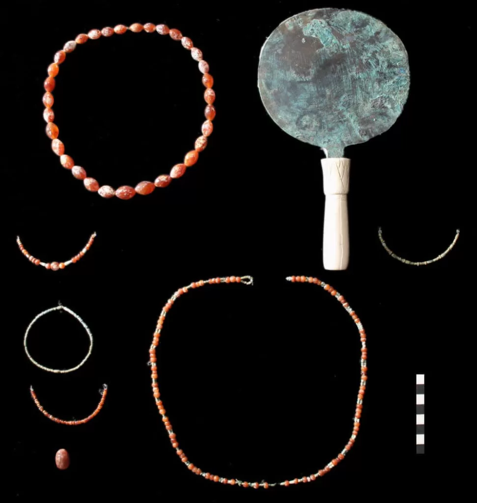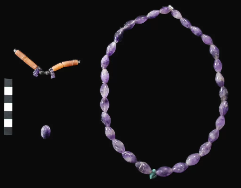 Among the most prominent archaeological finds in the cemetery is a unique pendant consisting of 30 cylindrical beads of amethyst stone with two cylindrical beads of agate surrounding a hippo-head-shaped amulet.