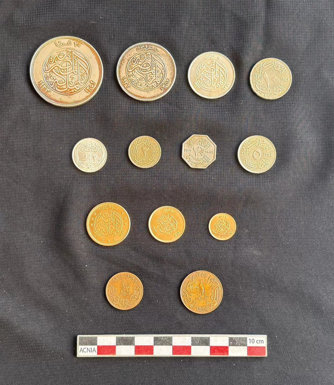 The trove includes coins from King Fuad I’s era, a rare two-piastre coin from Sultan Hussein Kamel, several silver coins (5, 10, and 20 piastres), and three exceptionally scarce gold coins (20, 50, and 100 piastres) from King Fuad I, each considered among the rarest issues in modern Egyptian numismatic history.