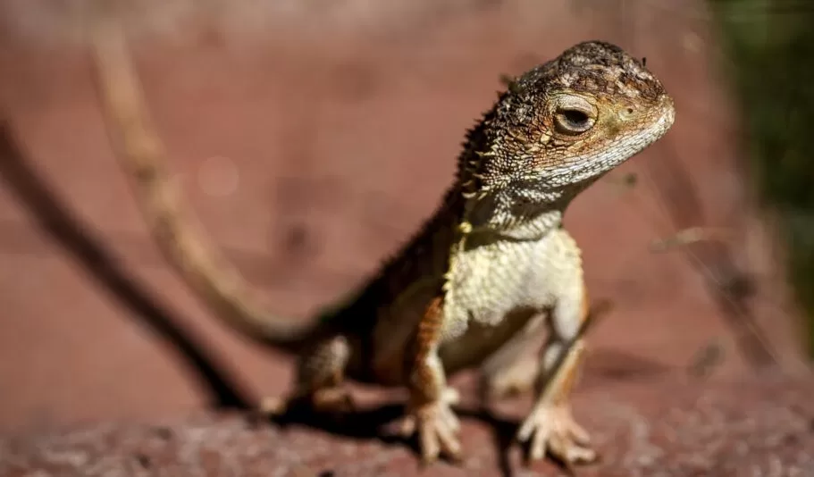 The earless dragon — which is light brown and has long white stripes down its body — measures about 15 centimetres (the size of a U$1 bill) when fully grown.