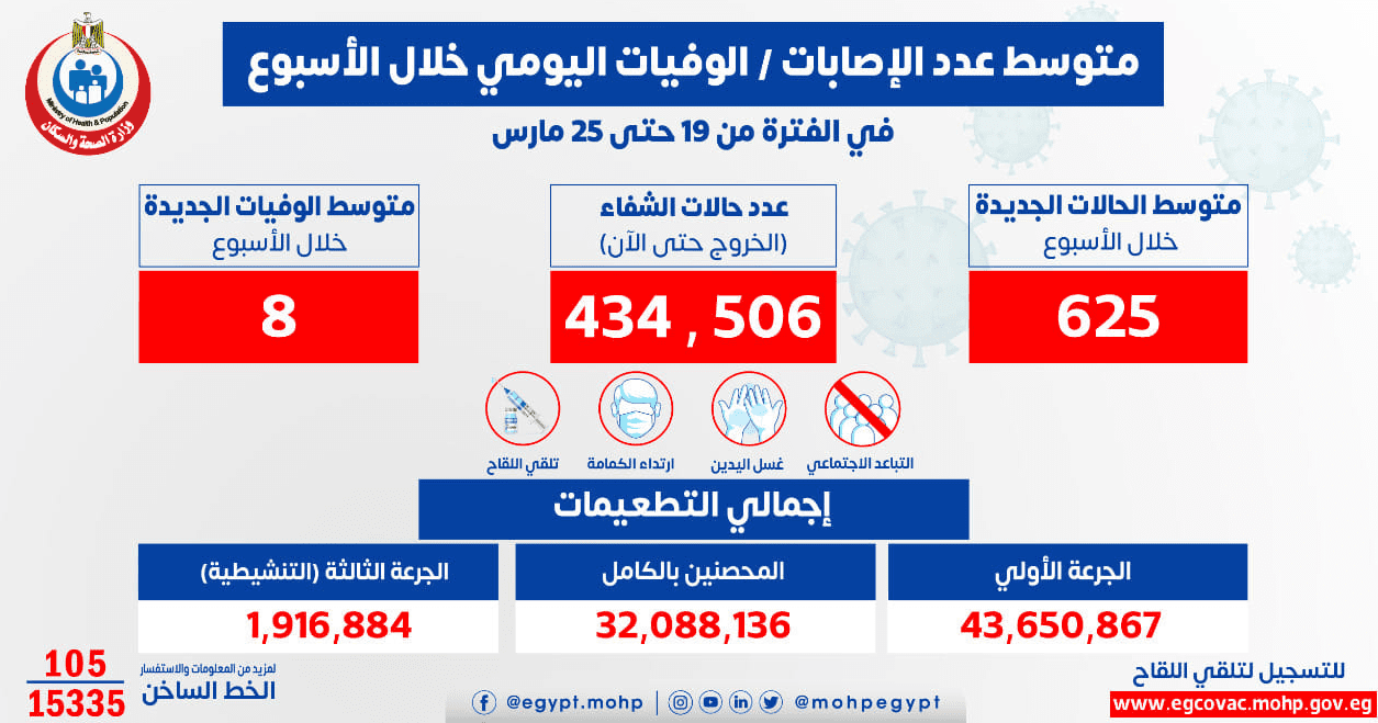 In a statement, Spokesman for the Health Ministry Hossam Abdel Ghaffar said the daily average of recoveries recorded 615, bringing the total number of recoveries to 434,506.
