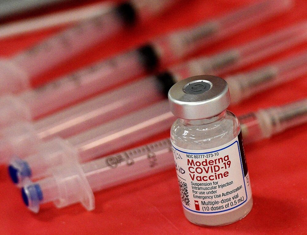 Syringes and a vial of the Moderna COVID-19 vaccine are displayed at a mass COVID-19 vaccination site in Batavia, Ill., on March 19, 2021.