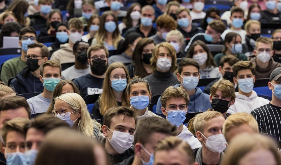 Students wear mouth-to-nose coverings while sitting close to each other during the lecture 'BWL 1' in the Westfaelische Wilhelms-Universitaet in Muenster, Germany, Wednesday, Oct. 21, 2021.