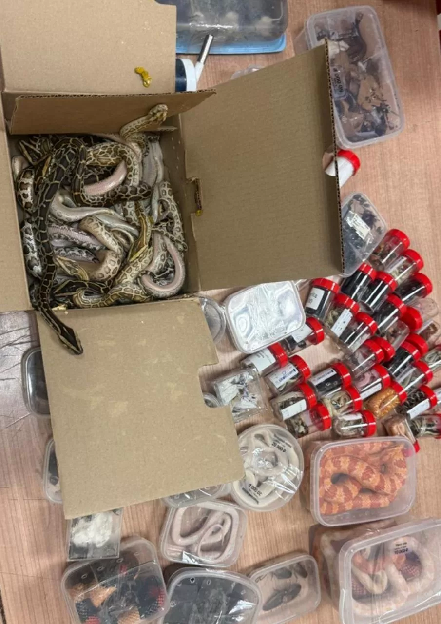 The search uncovered 45 scorpions, including Vietnamese forest and Brazilian yellow varieties, along with 65 other species, among them four highly venomous red and black spitting cobras. Additionally, customs officials discovered a variety of rare snakes, insects, spiders, cockroaches, and worms.