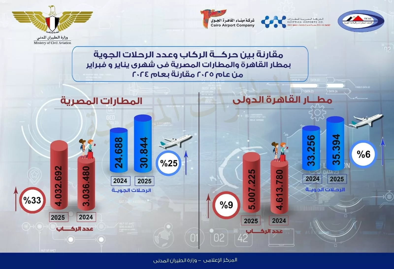 Egyptian airports recorded a notable rise in passenger numbers and flight operations during January and February 2025 compared to the same period last year. The increase reflects growing travel demand and the aviation sector’s ongoing recovery.
