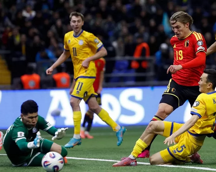 But Belgium, which had routed Kazahkstan 6-0 in September, was unable to take advantage of playing with an extra man from the 79th minute after Islam Chesnokov was red carded for a hard challenge on Jeremy Doku.