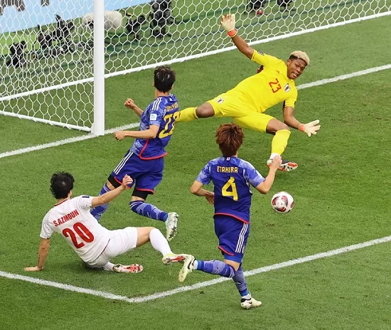Japan’s goalkeeper Zion Suzuki saves the ball from Iran’s Sardar Azmoun (20).