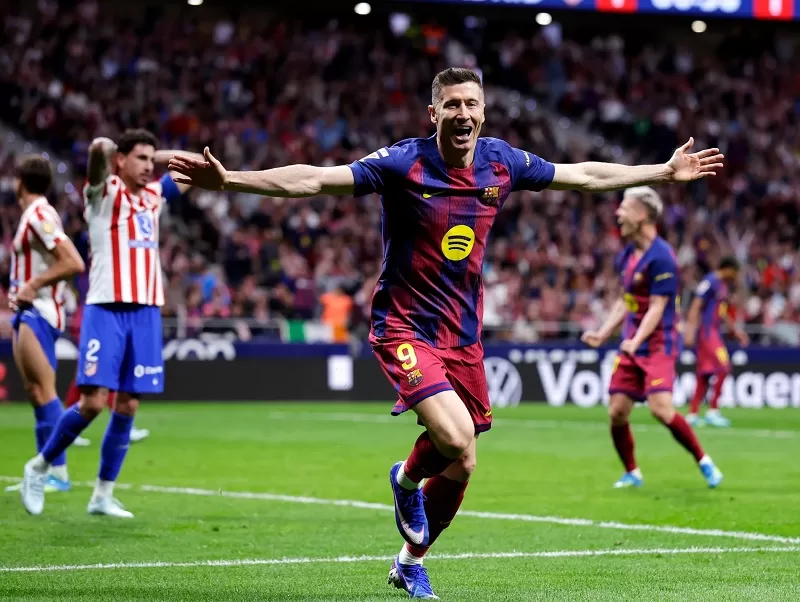 MADRID — Robert Lewandowski shouldered home a dramatic late winner for Barcelona as they edged Atletico Madrid 2-1 to move seven points clear at the top of La Liga after Real Madrid slipped up.