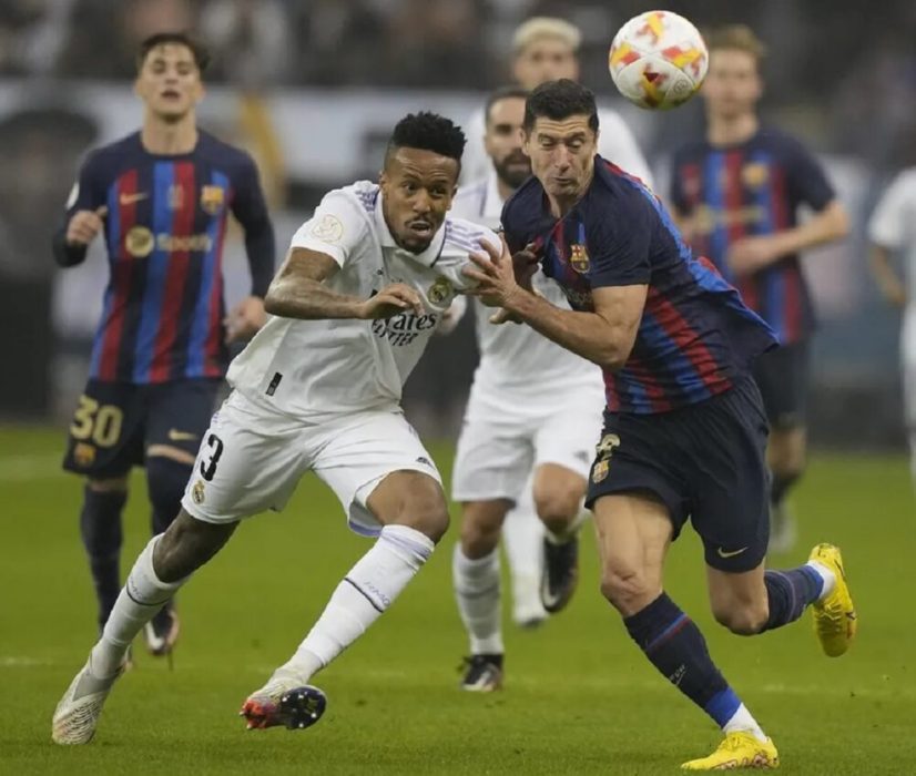 Real Madrid's Eder Militao (L) and Barcelona's Robert Lewandowski fight for possession during the final of the Spanish Super Cup in Riyadh, Saudi Arabia.