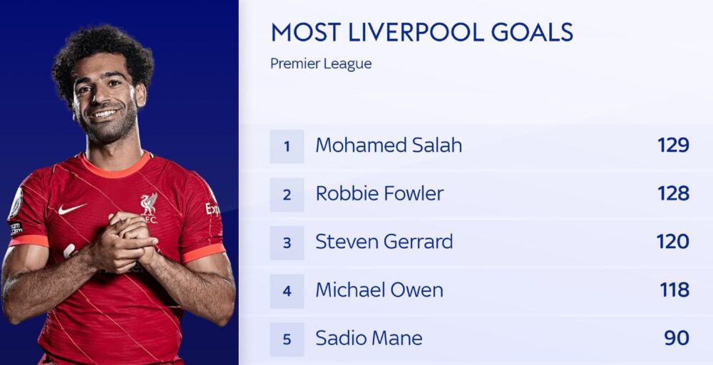Salah has become Liverpool’s all-time top scorer in the English Premier League.
